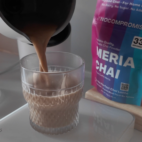 Meria Chai is a clean, bold, barista-style instant chai latte mix made with real black tea and spices. No sugar. No dairy. No fillers. Ready in 30 seconds — hot or iced.